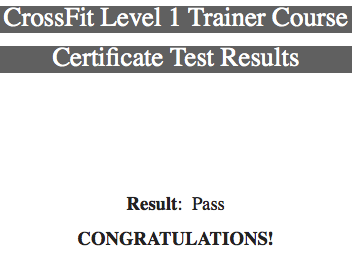 Even more exciting than this PR… I just got the email that I passed the test, so now I’m officially a CrossFit Level 1 Trainer! I scored a 40 out of 45 on the test.