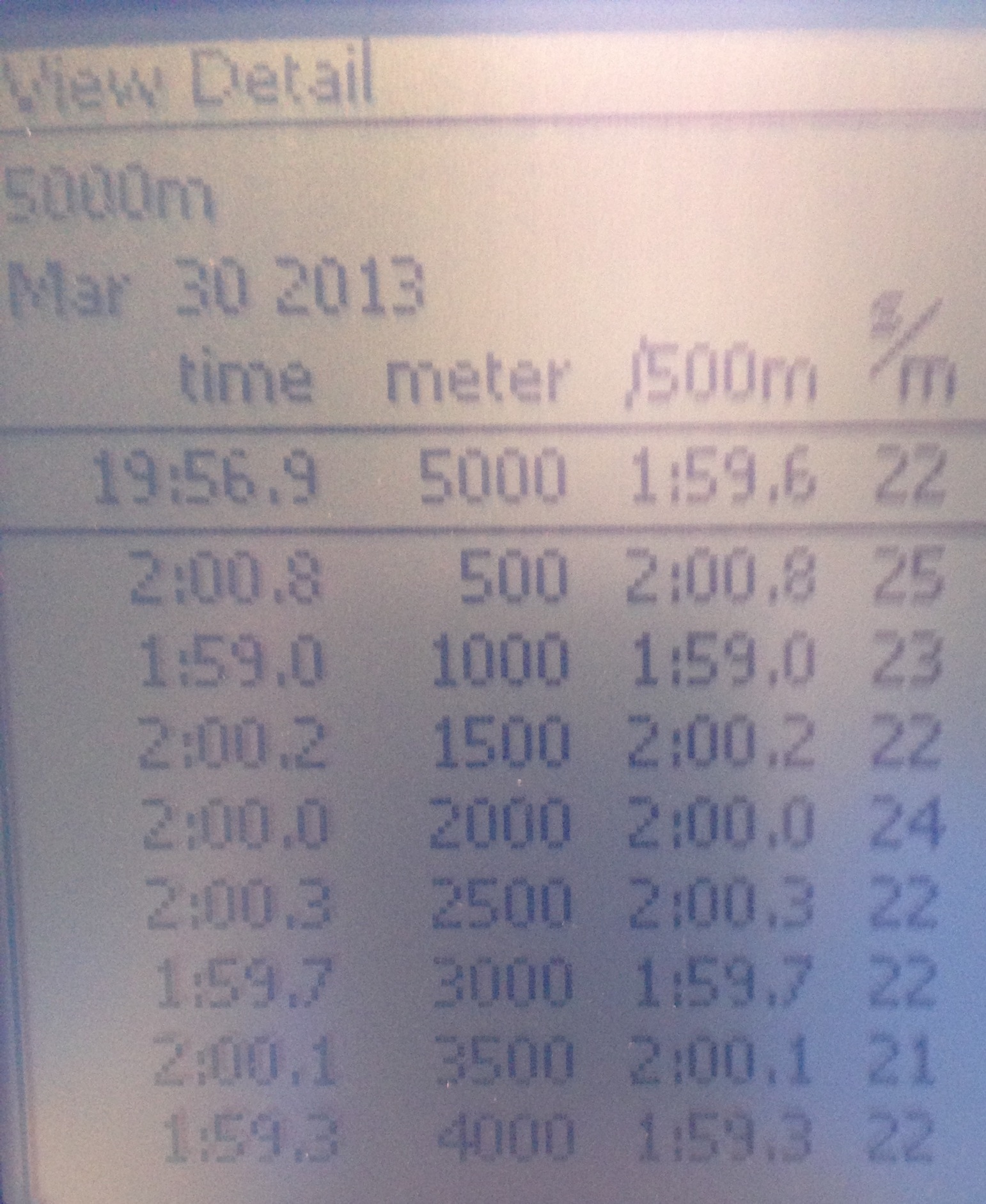 Off the Road Row I rowed a 5k in 19:56. My goal was to keep a 2:00/500m pace and I don’t think I could have been more consistent. Every split (other than the last where I gave some extra) was between 2:00.8 and 1:59.0! 43.469356 -83.999040
