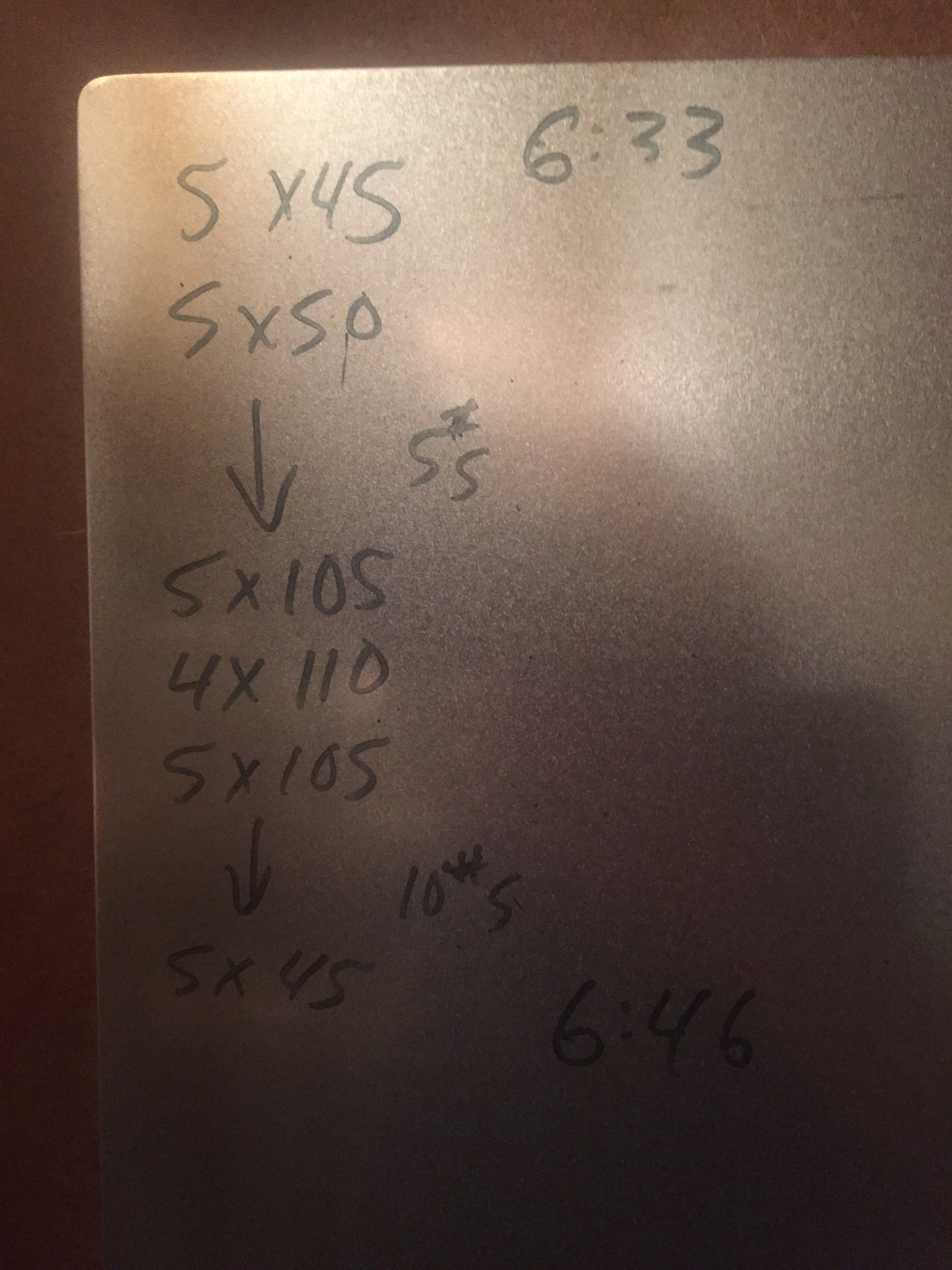 Tried something different. haha I only rested long enough to change the weights and record a few things on my board. As you can see, I didn’t write down much. 21 sets in about 13 minutes. I have a feeling I may regret this for the next couple of days. Maybe not the best idea with the max bench press test coming Wednesday night.