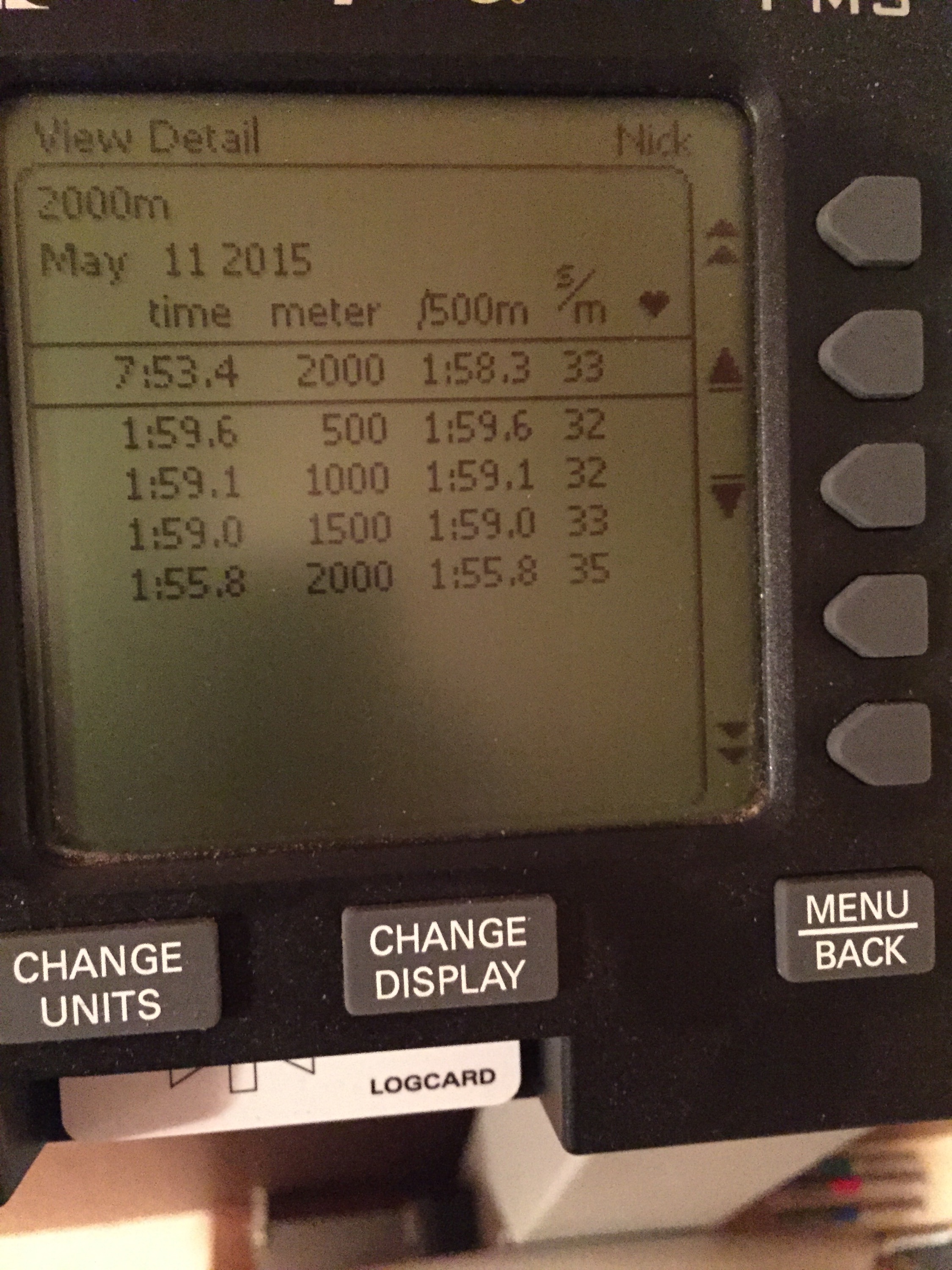 Came out to a 2:20 pace for the 500m. Finished in 2:18.9. I’d never really done a 2k for time on the ski machine. My best split was while going for 3,000 meters if that tells you anything. I started out with a 2:00/500m pace and figured I’d evaluate after 500m. Still felt right at 1,000m, but then with 500 left I knew I could pick it up a bit. Finishing time was 7:53.4 for a 26.2 second PR.