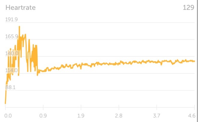 Didn’t feel like I started out fast, but my first mile pace was over a minute/mile faster than the rest of the run, where I settled in at about 11:00/mile. I think the heart rate reading were jacked at the beginning of the run when I had a few apps open that were all fighting for the HR data. I shut those down about 3/4 mile in and then the HR seems to have leveled off after that around 115-120 bpm and slowly increased over the run to the low 130s.