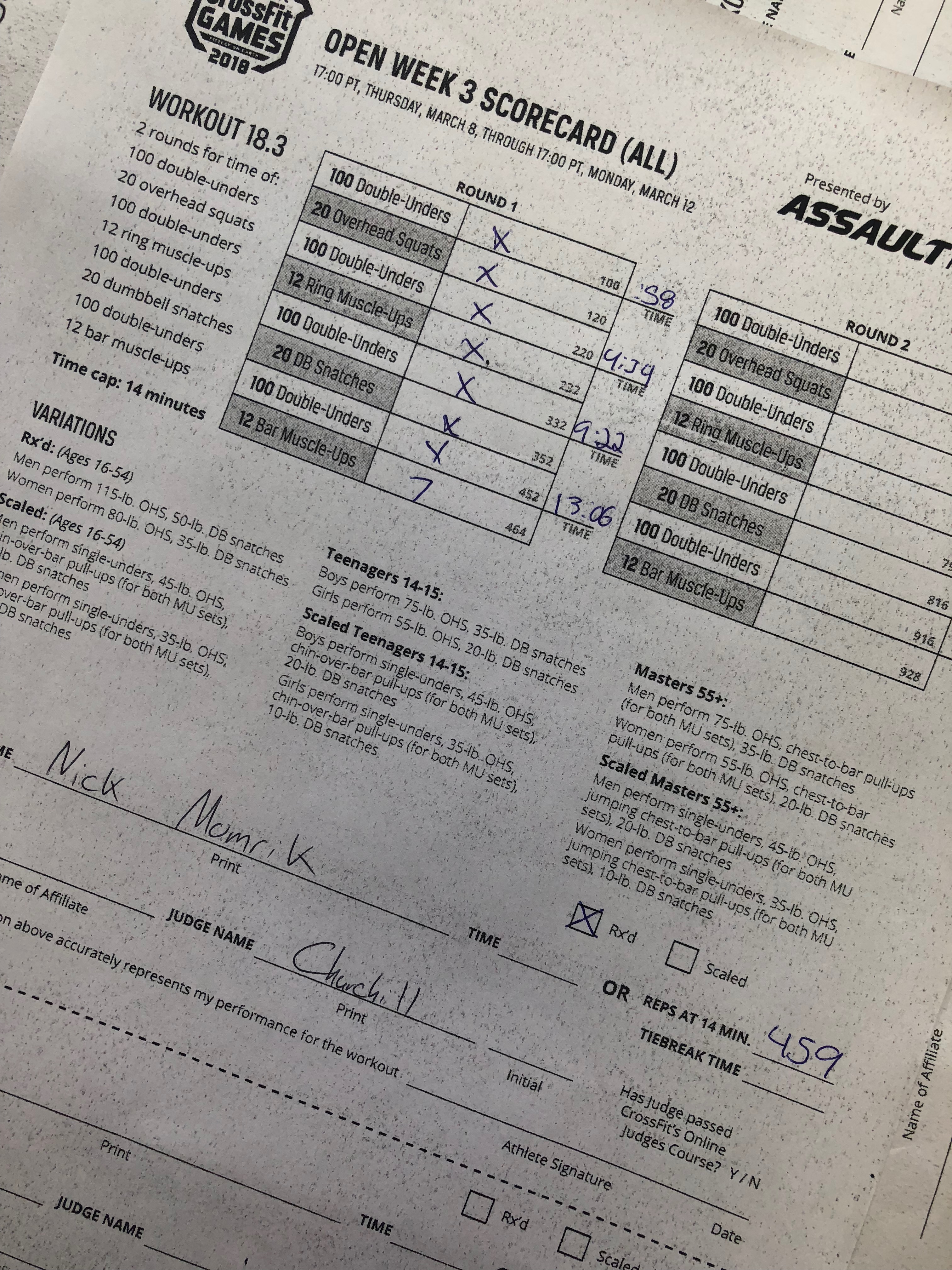 Managed to get the first set of double unders unbroken and then did 12-8 overhead squats. Second set of dubs wasn’t too bad. I went 3×3 on the rings with kind of long rests after those sets and then 3×1 with short rest. I was feeling I might fail so didn’t want to push the big set. Should have tried for shorter rest. Started to lose my dubs after that. The snatches felt heavier than I expected and I put it down halfway through. Weak! My 4th set of dubs was a struggle and I was getting pissed as I watched the clock tick away. I was leaning over and resting too much too. I started to worry I wouldn’t have time for any reps on the bar. Finally finished at 13:06 and did 2-2-2-1 to finish with 459 reps.