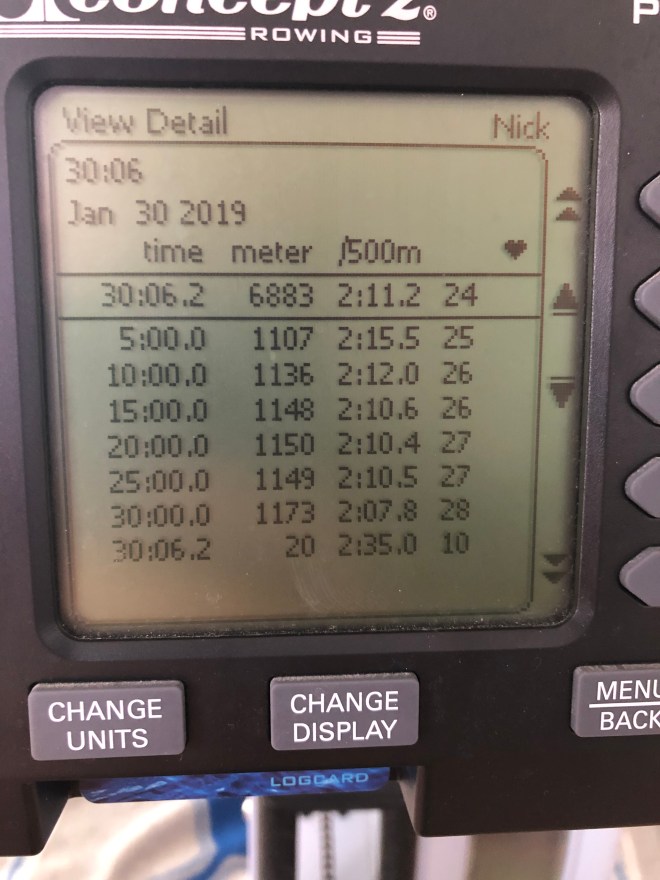 At around the 20 minute mark I started to feel my ass, so I can’t imagine sitting in that seat for a marathon row. Did 6,863 meters. Always feels good to get negative splits.