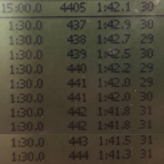 There were some 20 second intervals in phase one with 1:40 rests, so I wasn’t sure what kind of pace to go for these. I thought 1:26-1:28/500m might be good, but was worried about the short rest. Since there is a minimum interval time of 20 seconds on my rower I set it for 20/40, didn’t use the first interval, and waited until there was 16 seconds left before I grabbed for the handle each time. This makes the average pace and stroke rate useless though. My meters were: