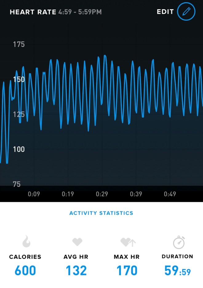 Yes, an hour fucking long! Took the first few intervals to ease in to it and warm up. Then we held a very consistent pace (42-43s) until speeding up a little for the final four and especially the last one. With about 12 left my legs were starting to feel real heavy, especially the third 50m. We did switch running directions halfway through. Walked a lap to cool down.