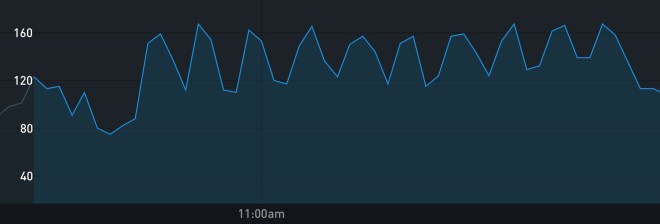 Last time I did this workout I tried to keep > 1,400 cal/hr and today I was able to do over 1,500, while still keeping a solid pace on my burpees. My only misses on the rope were two back-to-back misses in round five with about five reps to go. This workout is such a grinder.