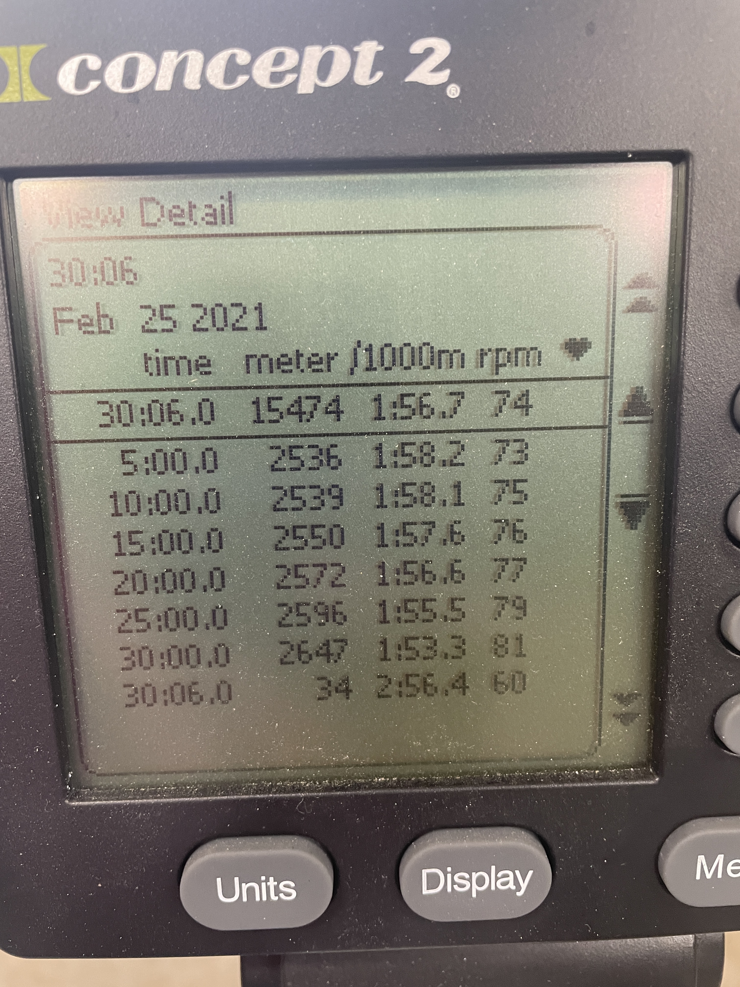 Went a total of 15,440 meters and had negative splits every five minutes. For some 10k reference I was at a 1:57.6/1,000m average pace at that time. I kept lowering the damper and increasing my RPM throughout the 30 minutes.