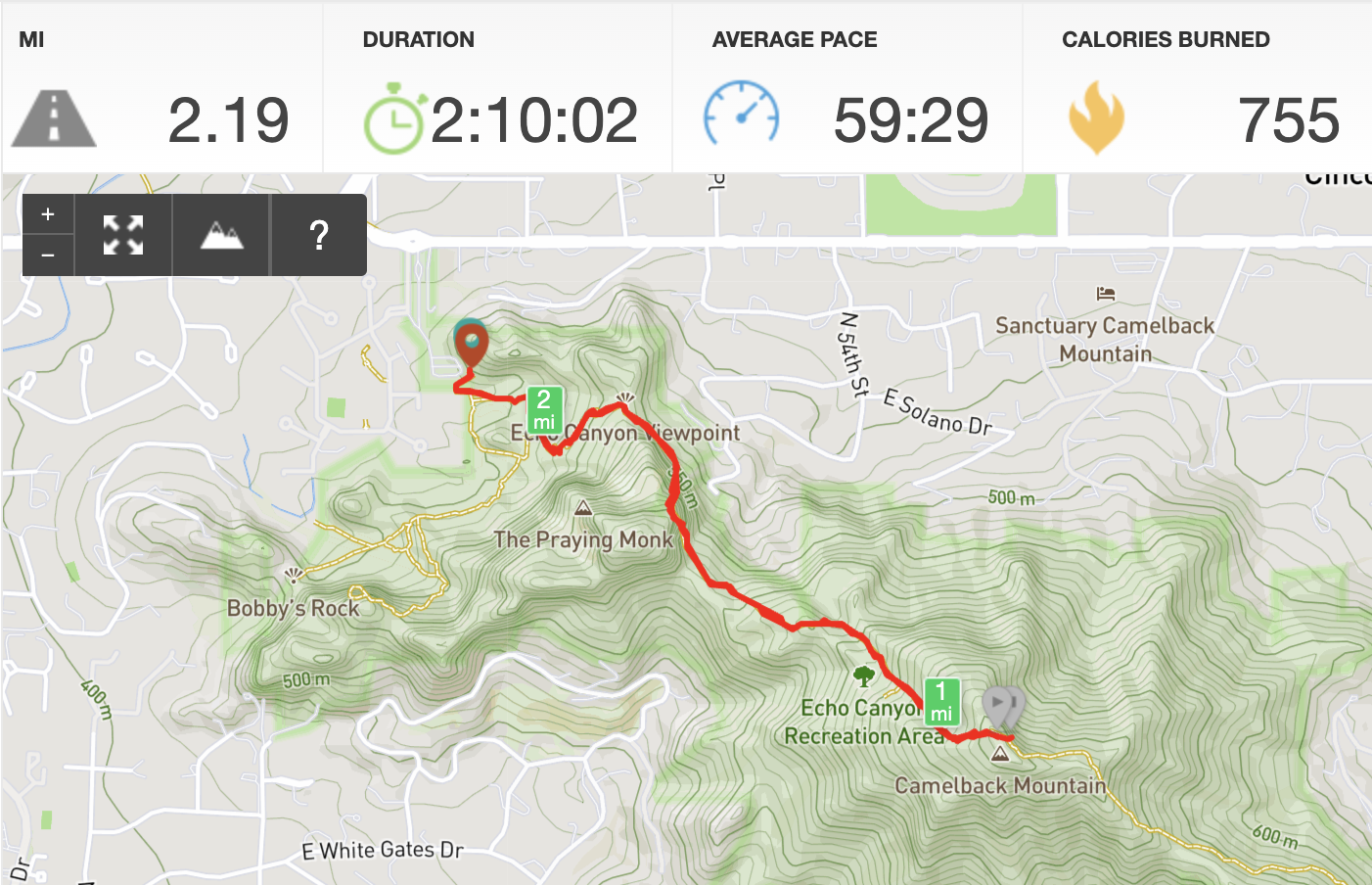 We hiked Camelback Mountain in Phoenix, a bit after sunrise, before the 100° temps hit. Went 2.19 miles in 2:10:02 with 1,515 feet of elevation gain and then descent.