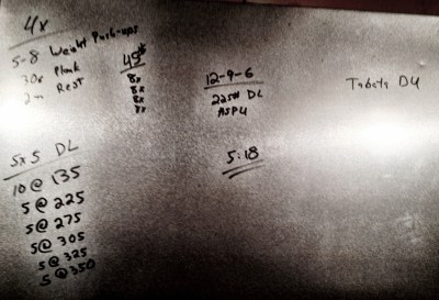 I did this same thing back in June in a time of 4:49, but I had to resort to using an AbMat an even kipping with the AbMat for the HSPUs. Today I didn’t use an AbMat at all and finished in 5:18. The set of 6 at the end was brutal. I had to kip one at a time and come down off the wall to rest. I’m sure the weighted pull-ups and planks didn’t exactly help with the arm exhaustion. The deadlifts weren’t a big deal, but they do fry your back a bit, making it hard to keep a good position on the wall. I broke the set of 9 into 5 and 4, but the 12 and 6 were unbroken.