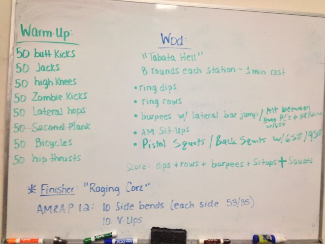 The strength work was five sets of back rack lunges with the sit-ups. I did the walking lunges so I wouldn’t have load directly on my spine and so I could still load up my legs. Figured I might as well do it for time. Finished in 6:44. I think it’s been a month since I did a sit-up! Since the class got 18 minutes on the clock I had a nice long rest before the programmed met-con.